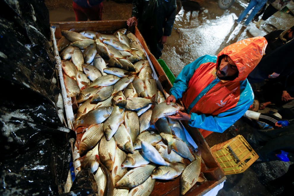 在城市納傑夫(Najaf),一名漁夫正在路邊販售他自己抓的魚。魚被隨意地舖在他面前的桌上,等待客人的挑選。