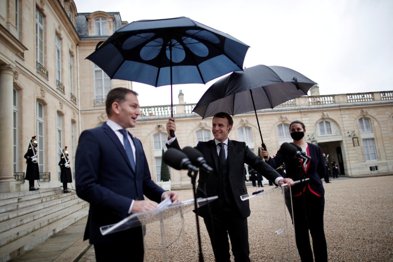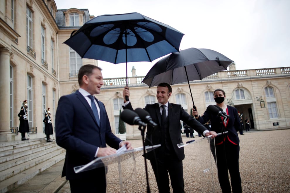 在巴黎的總統官邸及辦公室愛樂舍宮(Elysee Palace),斯洛伐克總理馬托維奇(Igor Matovic)正在接受記者訪問,法國總統馬克宏(Emmanuel Macron)堅持要幫他撐傘,即使助理三度上前想要幫忙,他也還是不願意放下他的傘。