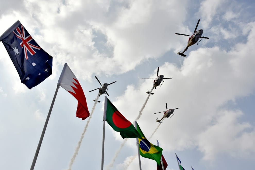 在城市邦加羅爾(Bengaluru)的耶拉漢卡空軍基地(Yelahanka air base)的 2021印度航空展上,印度空軍駕駛著直升機展開了空中表演。
