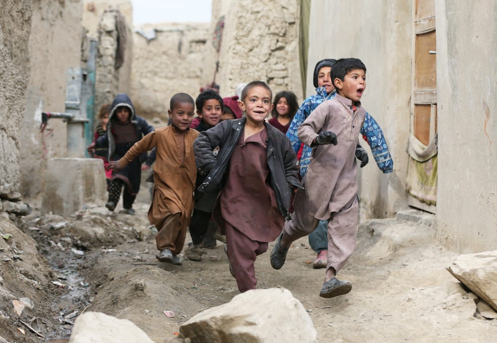 在喀布爾省(Kabul)的郊區,一群原本流離失所的孩子正在庇護所的外頭一起玩耍。