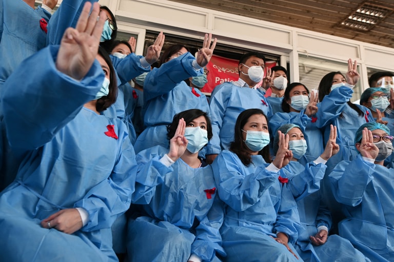 在仰光的仰光綜合醫院,醫護人員們別上紅絲帶並做出三指併攏的手勢,表達對緬甸軍方發動政變並逮捕翁山蘇姬的抗議。