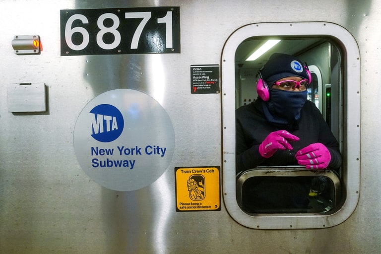 在紐約曼哈頓(Manhattan)的福爾頓轉運中心站(Fulton St. station),一名戴著螢光粉眼鏡、螢光粉耳罩,以及螢光粉手套的地鐵工作人員正在值勤。