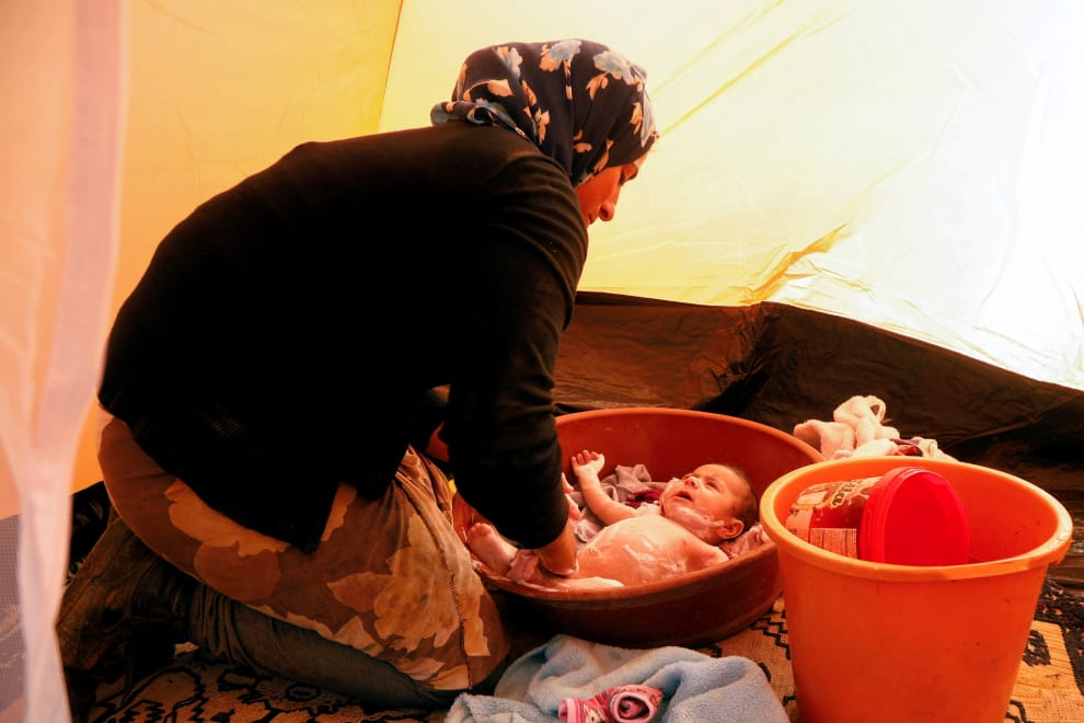 在約旦河西岸的希爾貝胡薩小鎮,一名巴勒斯坦女子正在臨時帳篷裡為她的孩子洗澡,該小鎮有許多建築在近日被以色列軍方拆除。