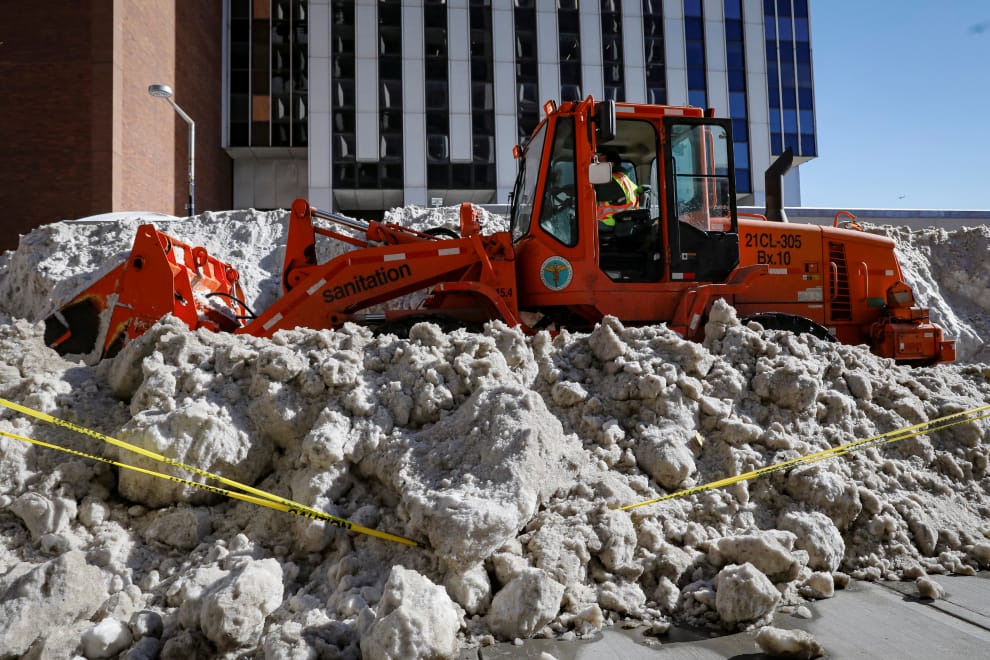在連日的暴風雪後,紐約市環衛局的人員開著工程車,在金融區剷除堆積如山的雪。