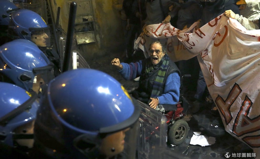 示威者對著鎮暴警察怒喊,義大利羅馬市區中的民眾抗議興建一條連接義大利北邊都靈(Turin)到法國萊恩(Lyon)的鐵路