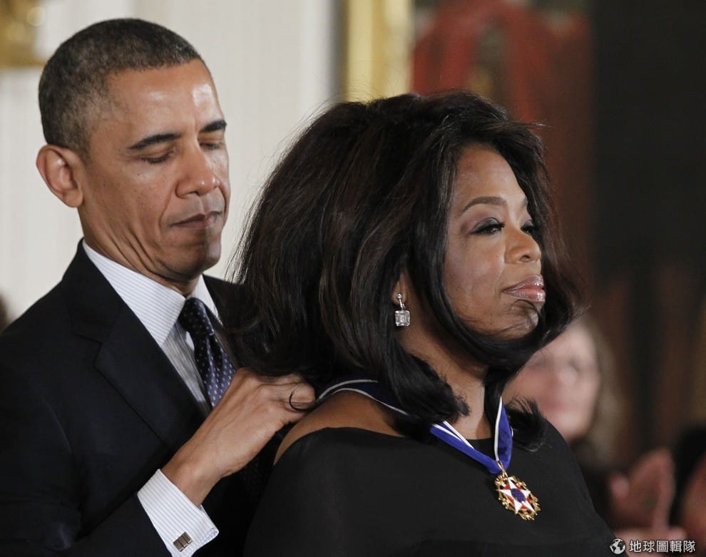 美國總統歐巴馬正替美國知名主播歐普拉(Oprah)戴上總統獎章之自由獎(the Presidential Medal of Freedom)