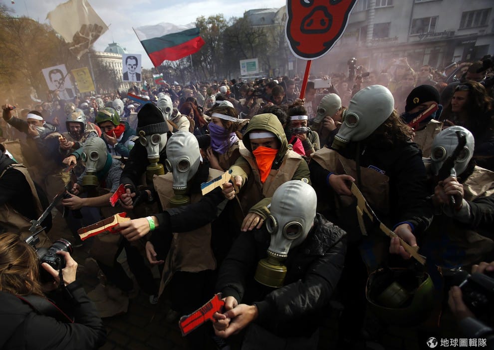 學生戴著面罩、手拿紙板做的假槍站在政府大門前,一同抗議政府腐敗、低薪資、高失業率的問題