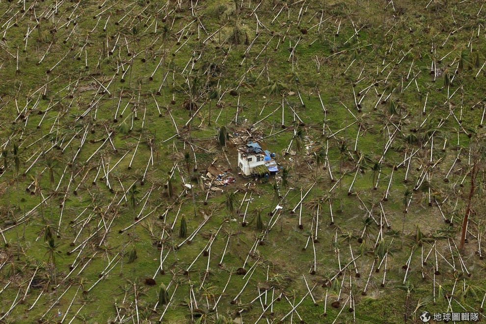 空中俯瞰薩馬省東邊的一個區域,當地的樹林全部倒下,中間是一幢毀壞的屋舍。海燕風災中受創最深的就屬中部的薩馬省還有雷伊泰省最嚴重