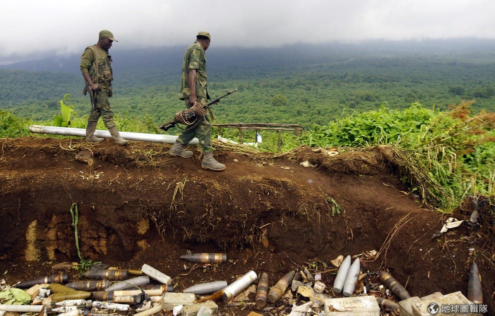 剛果軍人走過一片滿是砲彈的區域,這塊區域是之前當地反抗軍M23所使用
