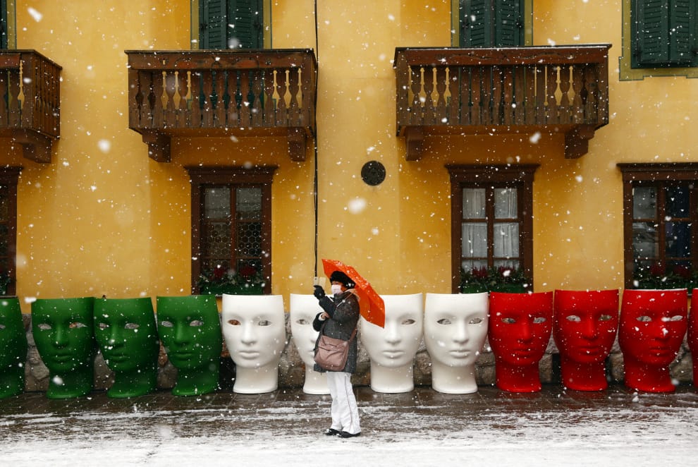 在義大利北部的科爾蒂納丹佩佐(Cortina d'Ampezzo),最近這裡正在舉辦世界高山滑雪錦標賽(FIS Alpine Ski World Championships),街道上也擺滿充滿義大利風味的裝飾,加上美麗的雪景,讓這名女性忍不住停下腳步,拿出手機來拍照。