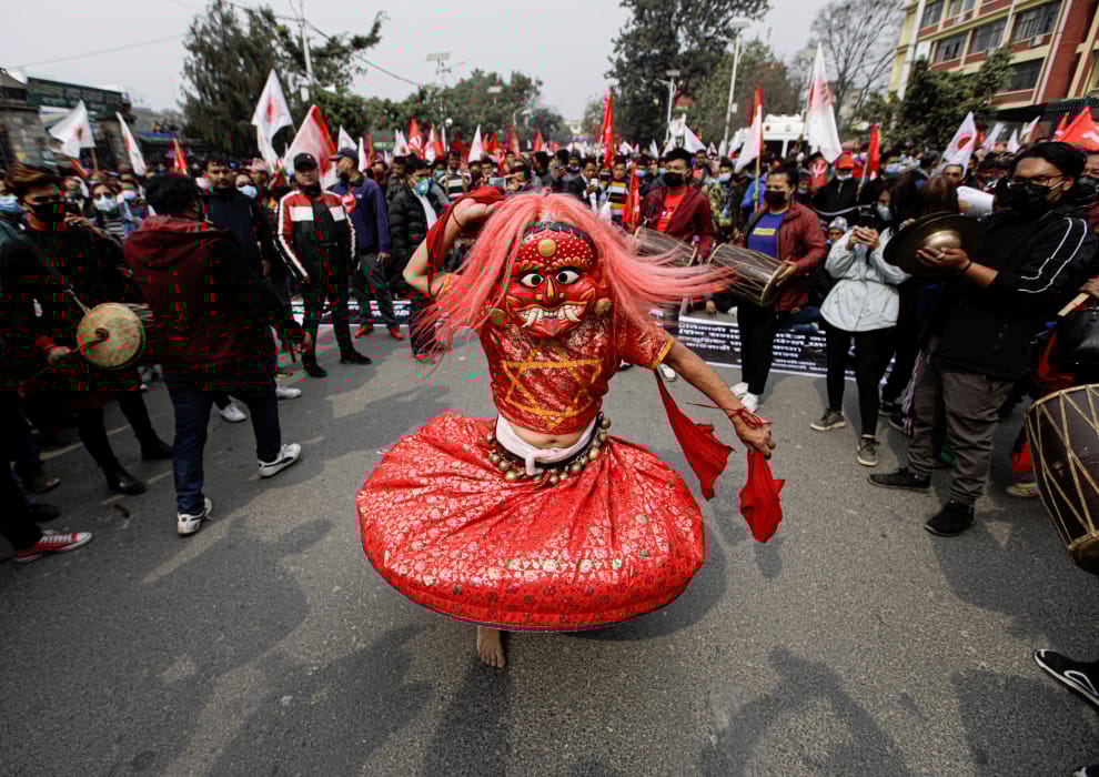 在尼泊爾首都加德滿都(Kathmandu),一名尼泊爾共產黨的支持者打扮成尼泊爾民間傳說中的惡魔「拉赫(Lakhey)」的樣子,加入街上大批反對現任尼泊爾總理奧利(KP Sharma Oli)的示威者中。