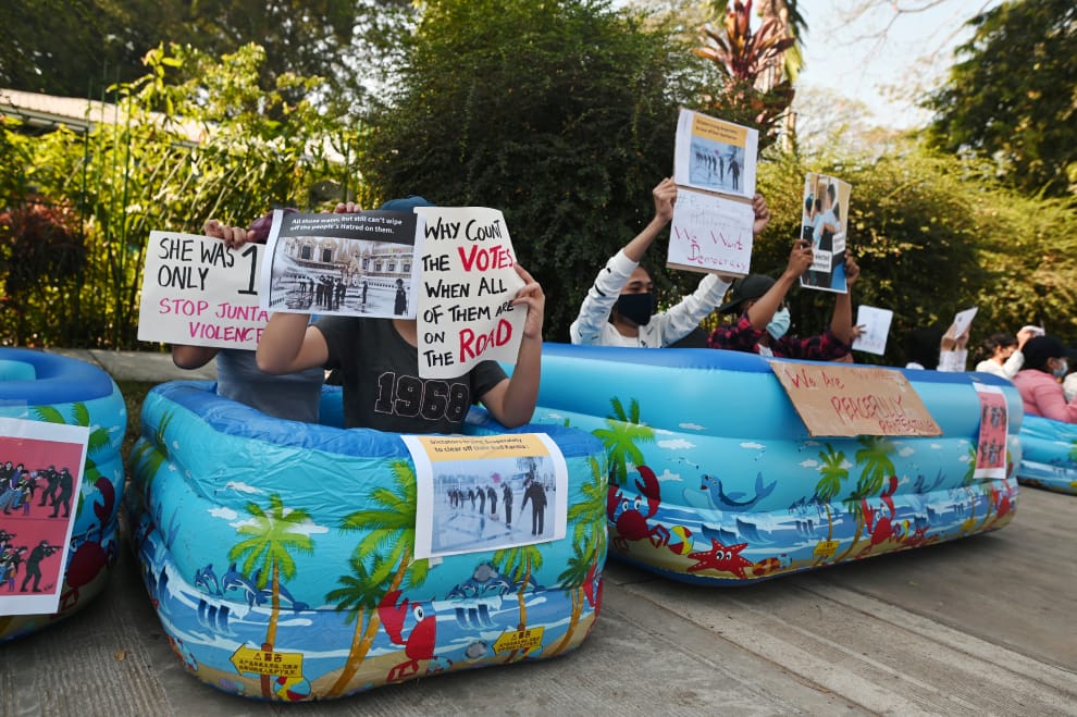 在緬甸大城仰光的日本大使館外,反對軍方政變的緬甸示威者坐在充氣游泳池內,高舉著標語要求軍方儘早釋放現任緬甸國務資政翁山蘇姬(Aung San Suu Kyi)。