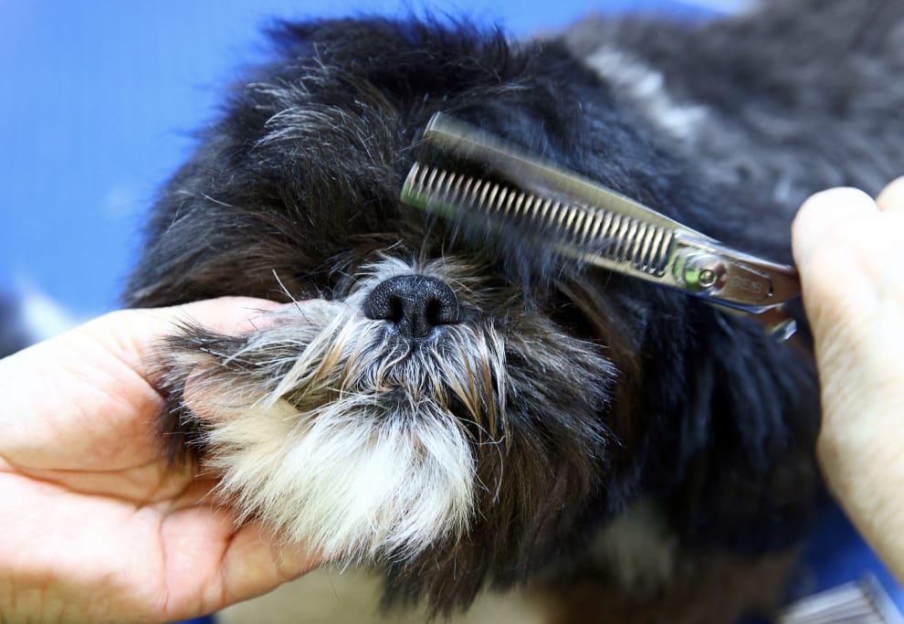 在奧地利首都維也納,西施犬里歐(Leo)乖乖地讓寵物美容師替牠剪劉海。
