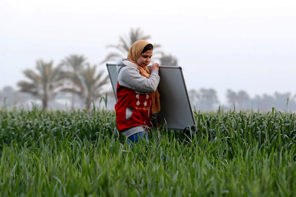 在埃及北部代蓋赫里耶省的阿特米達村(Atmida village),今年年僅 12歲的女孩埃爾窟莉(Reem El-Khouly)帶著一塊板子,準備去學校上課。