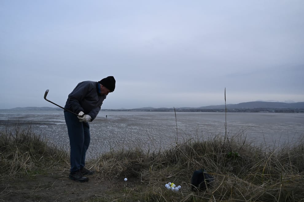 在愛爾蘭首都都柏林(Dublin)市郊,熱愛高爾夫球的比漢(Peter Behan)在普爾貝格海灘(Poolbeg beach)上畫了一個圓圈,隨後站上路堤、拿出高爾夫球桿,試著將球打進海灘上的圓圈裡,藉此在這段無法上高爾夫球場練球的日子裡保持手感。