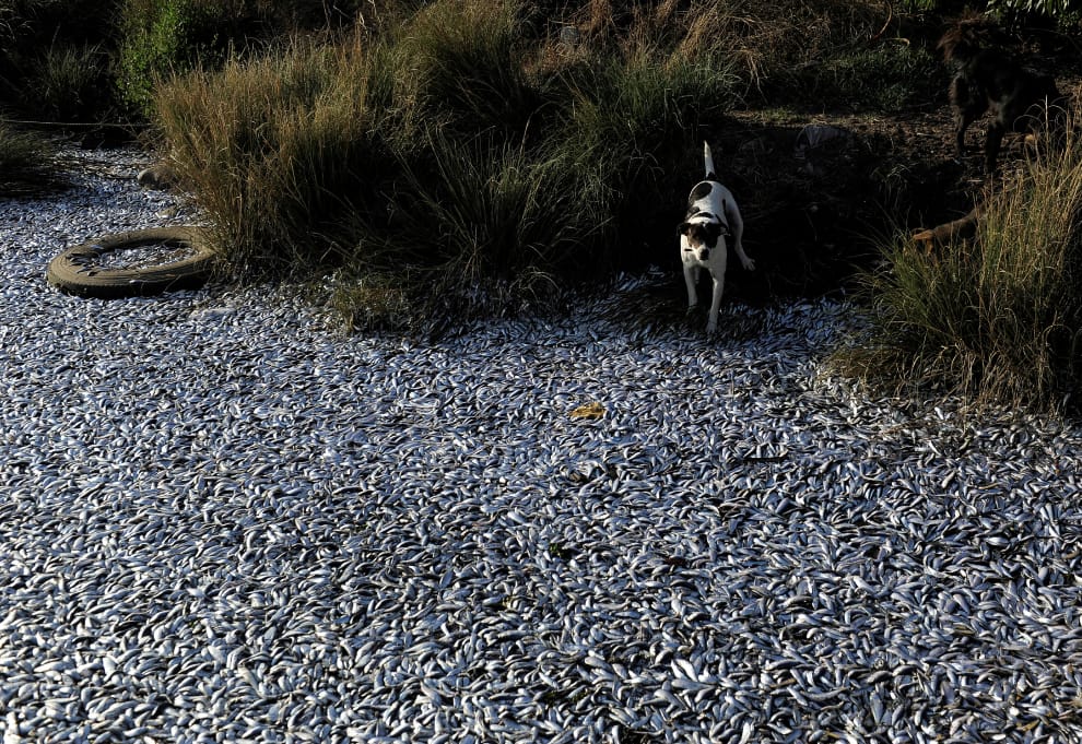在智利中部的拉拉奎特鎮(Laraquete)海邊,一隻狗兒望著眼前大量死魚的屍體,驚訝得一動也不動。當地政府在調查後表示,這批死魚應該是因為該水域缺氧而死。