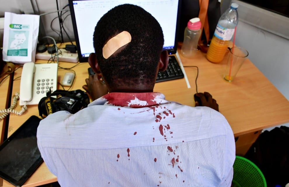 在烏干達首都坎帕拉(Kampala),一名《新視野》(The New Vision)報社的記者在採訪過程中遭警察毆打,但敬業的他在簡單包紮傷口後,便又繼續回到工作崗位上奮戰。