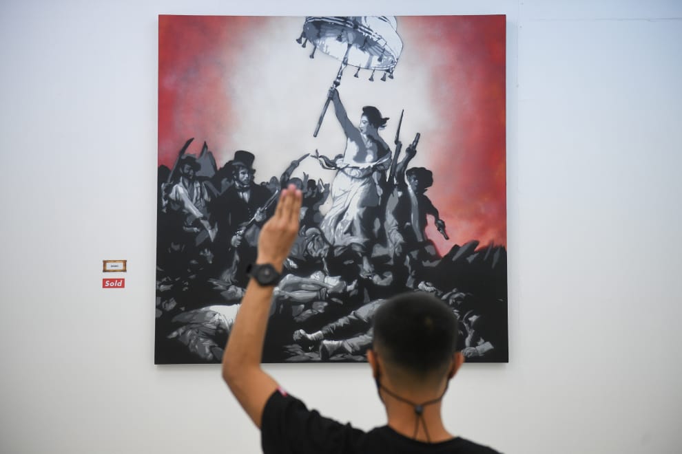 在泰國首都曼谷的WTF咖啡藝廊(WTF Gallery and Cafe),一名男子在藝術家「頭痛模板」(Headache Stencil)的作品前舉起泰國抗爭中常見的三指朝天手勢。