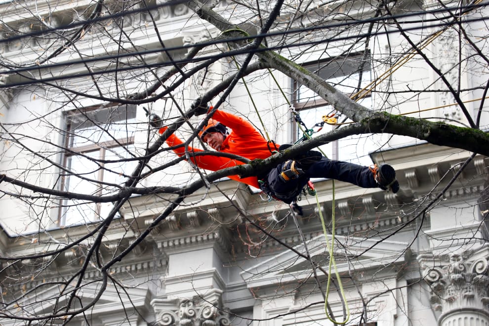 在瑞士大城蘇黎世(Zurich)街頭,樹木、花園植栽管理公司(Baum+Garten tree care company)的工作人員伊塞利(Reto Iseli)在半空中伸直了腰,打算修剪樹枝末梢的一段枯枝。