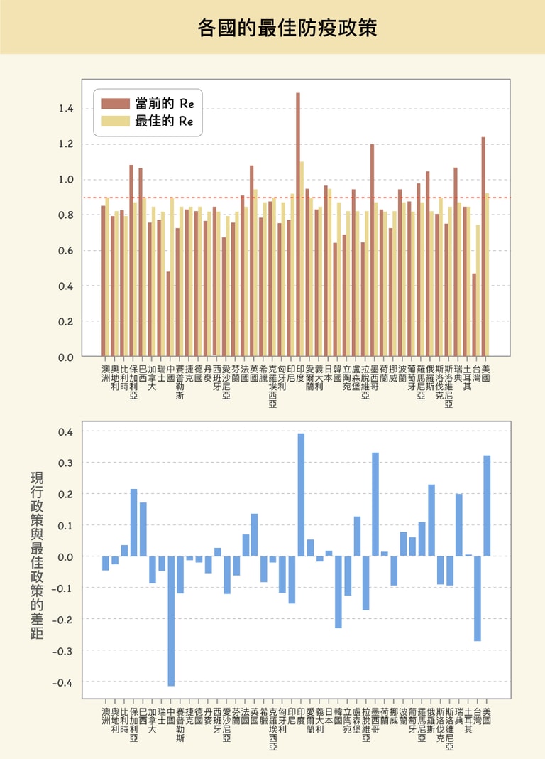 團隊根據實質收入、人民福祉兩項經濟指標,融合流行病學模型與數據,演算出各國的「最佳防疫政策」──也就是實質收入、人民福祉都能最大化的各國 Re 值。