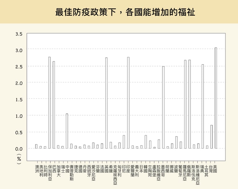 根據模型演算,如果各國採取各自最佳防疫政策,多數能增加 2.5% 福祉,包括美國、英國、印度。2.5% 聽起來微不足道,實際上,一兩年的差異如同發展基底,很有可能關乎後續深遠的經濟影響。