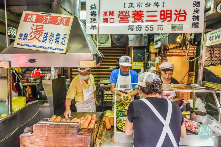在基隆廟口循著食物的香氣,映入眼簾的是整排小吃攤上顯眼的黃色燈籠,井然有序的攤位,充斥著各式各樣的美食選擇,熙熙攘攘的人群們排起了隊伍,一探究竟,是相當受到觀光客歡迎的「營養三明治」。