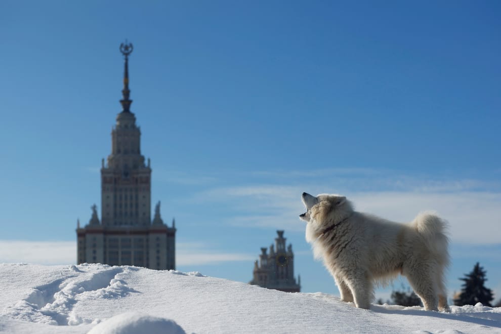 在俄國首都莫斯科,一隻狗兒朝著莫斯科國立大學(Moscow State University)的一棟建築物吠叫。