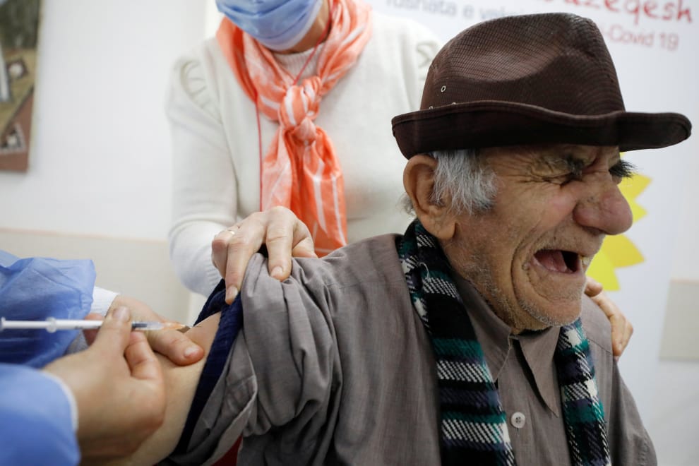 在阿爾巴尼亞西部非夏爾州(Fier)的一間安養院裡,醫護人員替一名年老的男子施打COVID-19(武漢肺炎)疫苗,讓他不禁痛得喊出聲來。