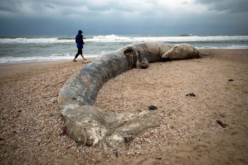 在以色列中部城鎮尼札尼姆(Nitzanim)的沙灘上,一名男子經過一條擱淺的鯨魚。