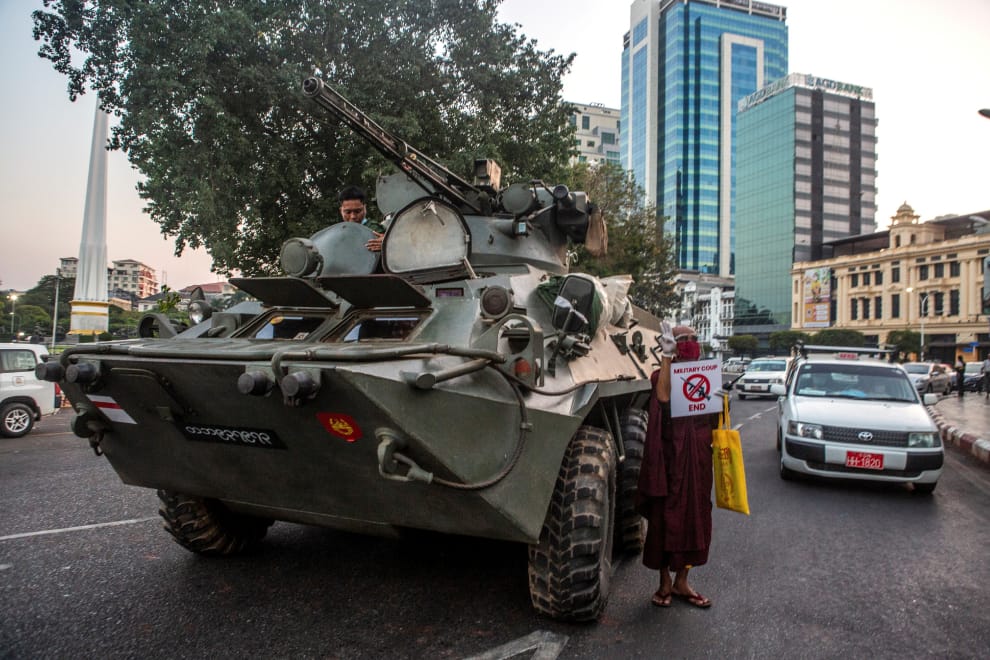 在緬甸大城仰光,一名反對緬甸軍政府發動政變的僧侶拿著標語,站在一台武裝車輛旁。