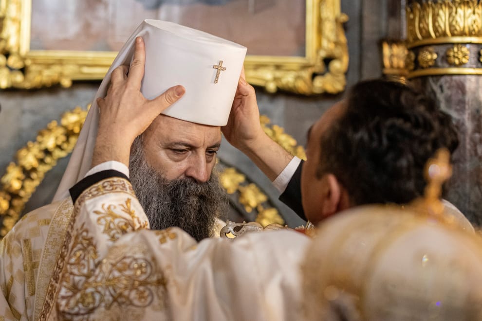 在塞爾維亞首都貝爾格萊德(Belgrade)的聖天使長米迦勒主教座堂(Cathedral Church of St. Michael the Archangel),塞爾維亞正教會(Serbian Orthodox Church)推舉佩里克主教(Bishop Porfirije Peric)為新任牧首(Patriarch),一名執事在就任典禮上替他戴上一頂白帽子。