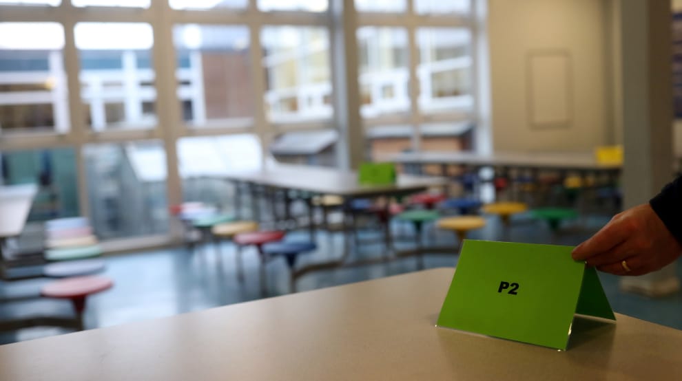 在蘇格蘭的小鎮皮特洛赫里(Pitlochry Scotland),下周一(22)皮特洛赫里高中(Pitlochry High School)的學生們就將重新回到學校裡上課,一名工作人員在一張桌子上放下一塊綠色牌子,為開學做好萬全準備。