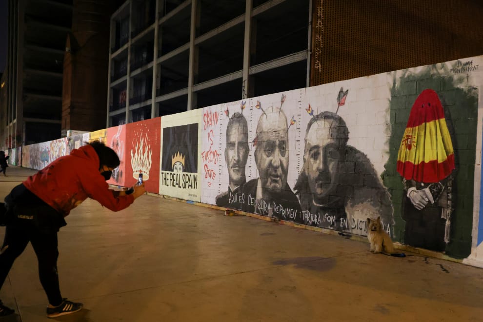 在巴塞隆納(Barcelona),一名加泰隆尼亞的街頭藝術家將現任西班牙國王菲利普六世(King Felipe VI)、前任國王胡安·卡洛斯一世(Juan Carlos),以及西班牙的最後一位獨裁者佛朗哥(Francisco Franco)畫在牆上,以表達對言論審查的不滿。