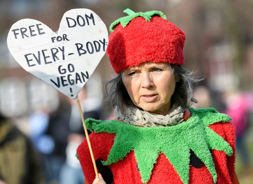 在阿姆斯特丹(Amsterdam),民眾因反對COVID-19(武漢肺炎)疫情的限制措施而走上街頭。其中一名示威人士被目擊到穿著草莓裝參加抗議。