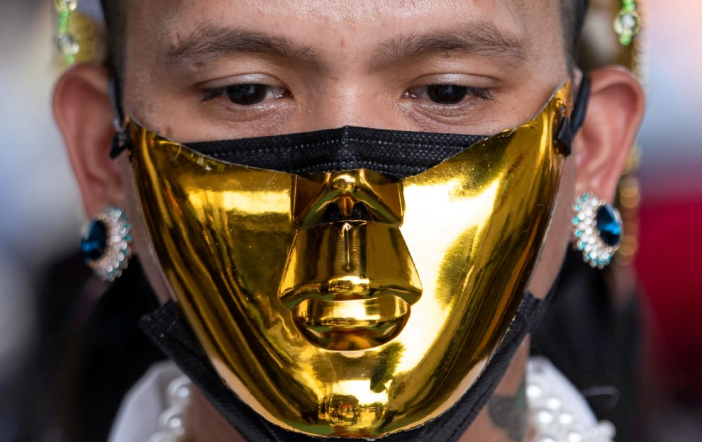 在城市仰光,一名戴著半臉金色面具的男子正在參與反對軍方政變的示威遊行。