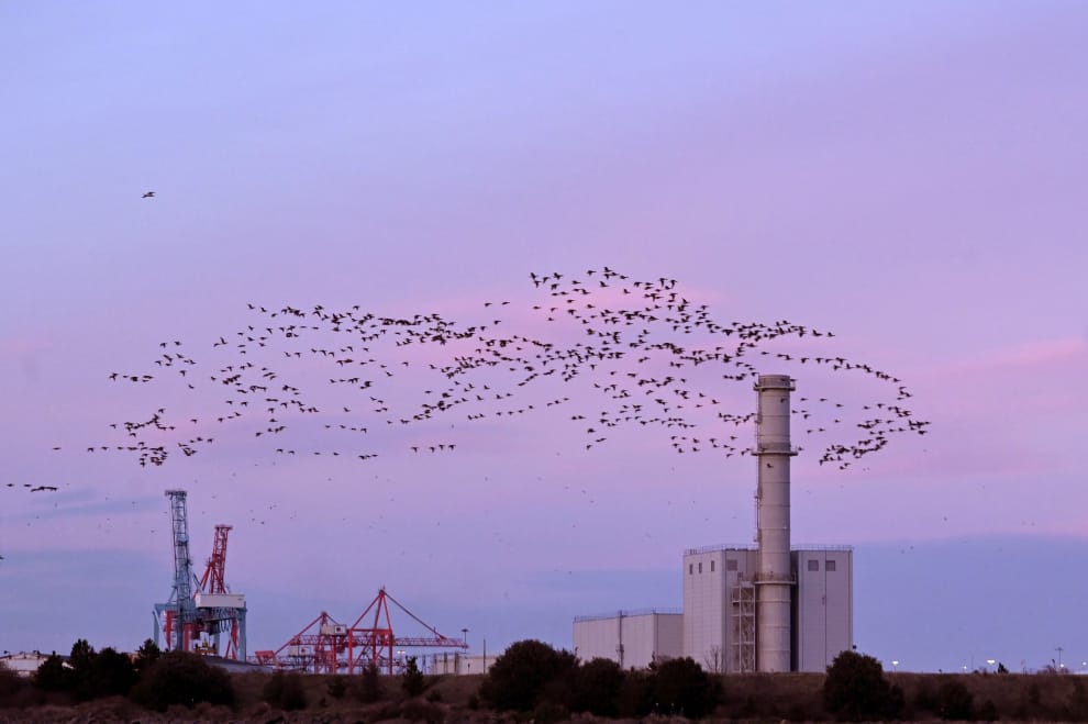 在首都都柏林(Dublin),一群黑雁在傍晚的時候自一座工廠上飛過,牠們正要飛向夜晚的落腳處。