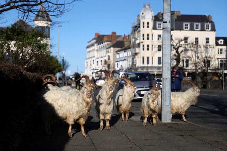 在威爾斯,一群來自岬角大奧瑪(Great Orme)的野生山羊,不知為何竟晃到了附近的蘭迪德諾度假小鎮(Llandudno)。因為COVID-19(武漢肺炎)疫情封城的關係,小鎮路上本來就沒什麼人,山羊們於是順勢逛起了大街。