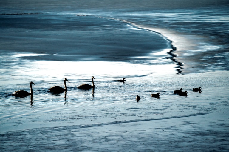 即使天氣寒冷,在城市靈斯泰茲(Ringsted),仍有一群天鵝和鴨子正在半結冰的湖泊裡游泳。