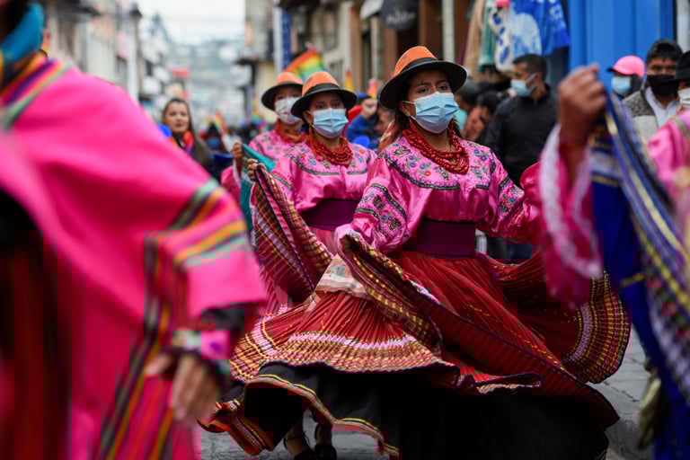 在城鎮拉塔昆加(Latacunga)的一場遊行,厄瓜多民俗舞團(Grupo Folklorico Mashi Danza)的成員、當地原住民,以及總統候選人培瑞斯(Yaku Perez)的支持者將往首都基多(Quito)邁進。