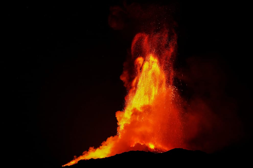 自本月 16號以來,歐洲的著名活火山「埃特納火山」(Mount Etna)已數度爆發。在 23號的一次噴發中,滾燙的岩漿直衝天際,跟夜晚的天空形成了強烈的對比。