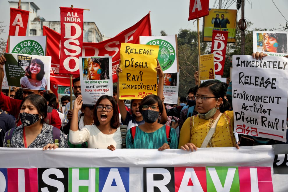 在加爾各答(Kolkata),抗議群眾走上街頭,聲援 22歲的環保人士拉維(Disha Ravi)。拉維在本月 13號,因為支持農民運動,而遭印度當局以涉嫌煽動叛亂的罪名逮捕。