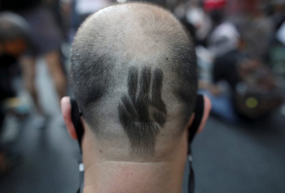 在首都曼谷的泰國皇家警察總部,民主派的示威者們為了抗議警察的腐敗問題而走上街頭,其中一人將自己的頭髮剃出代表反政府抗爭的三指手勢圖案。