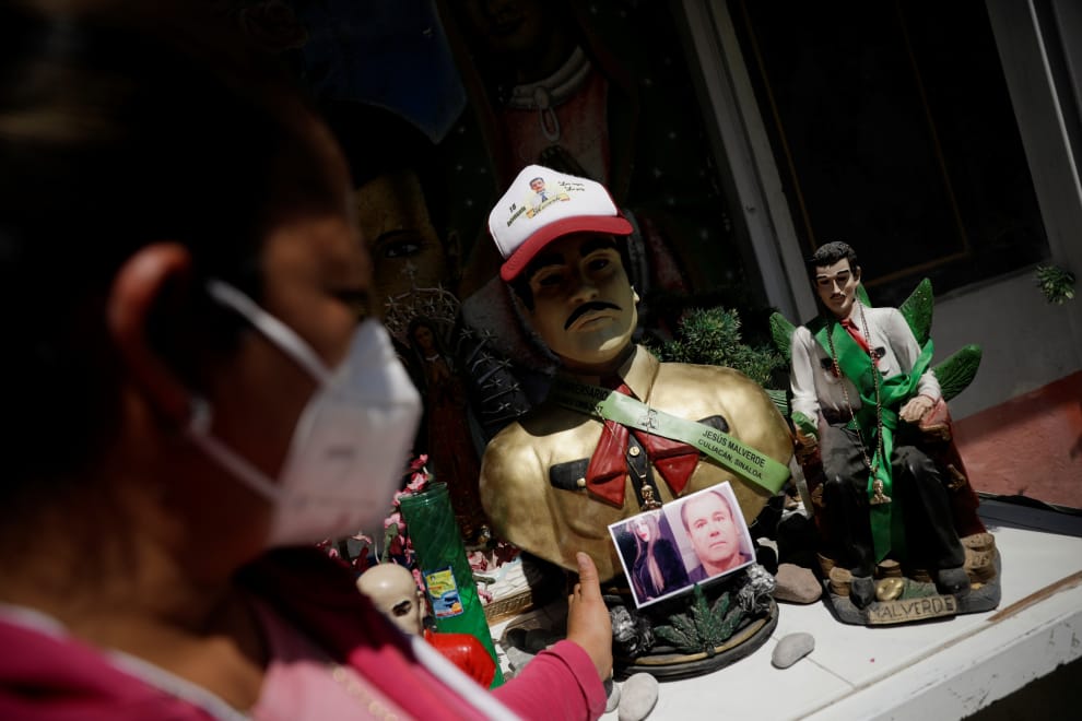 在首都墨西哥城(Mexico City),一位民眾正對著傳說中的本土羅賓漢「聖赫蘇斯·馬爾韋德」(Saint Jesus Malverde)祈禱。在祭壇前擺著的,是墨西哥毒梟之王、人稱「矮子」(El Chapo)的古茲曼(Joaquin Guzman),以及他的妻子柯蘿娜(Emma Coronel Aispuro)的照片。