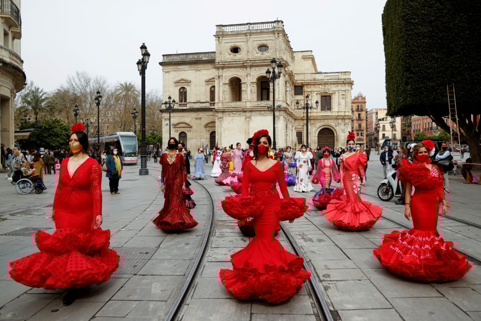 在城市塞維利亞(Seville),人們在這天穿著佛朗明哥裙走上街頭,要求政府重視因為COVID-19(武漢肺炎)而造成的佛朗明哥時尚業危機。