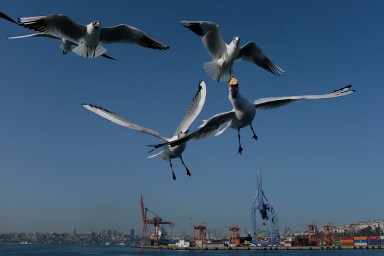 在城市伊斯坦堡(Istanbul),幾隻海鷗飛在博斯普魯斯海峽(Bosphorus)上,牠們正追逐著一艘渡輪,希望船上的乘客能再給牠們一些餅乾。