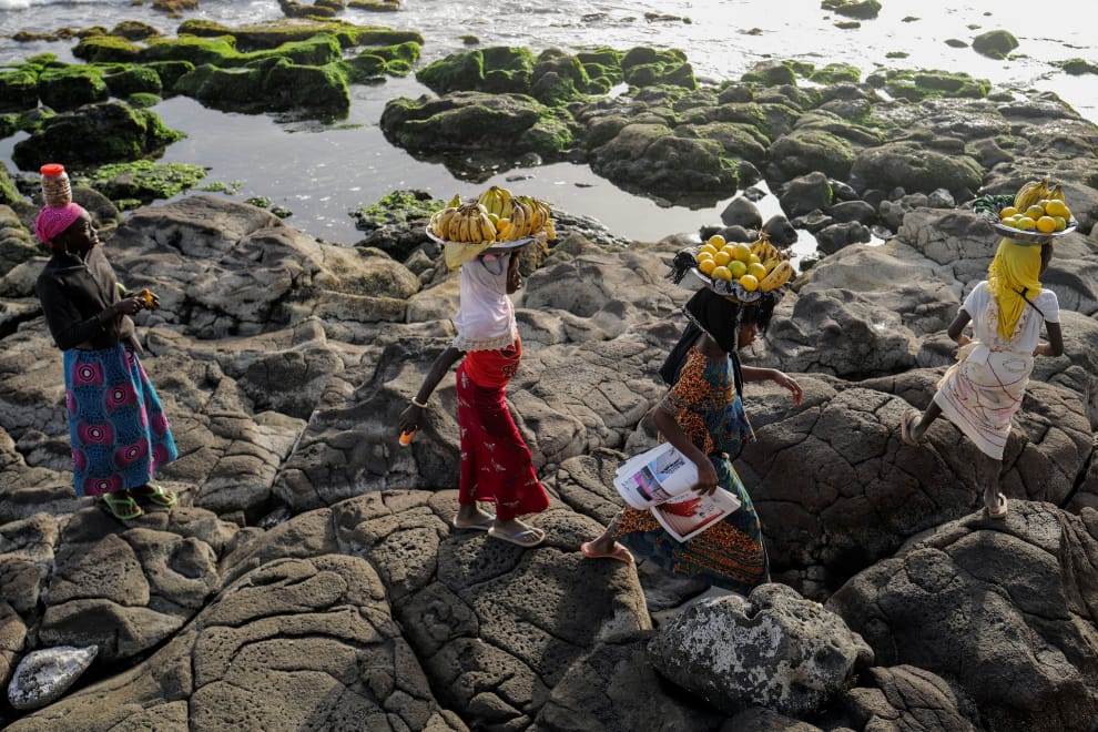 在首都達卡(Dakar),幾名女孩熟練地用頭頂著托盤,托盤裡放著香蕉和橘子等水果,她們正要將這些黃澄澄的果子拿去販售。