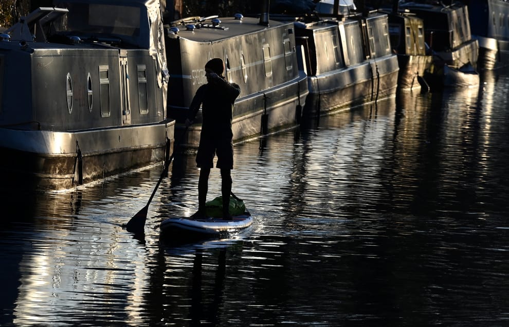 在倫敦,午後的陽光正稀疏灑落在攝政王運河(Regent's Canal)上頭。一名划著船槳的男子自河中而過。