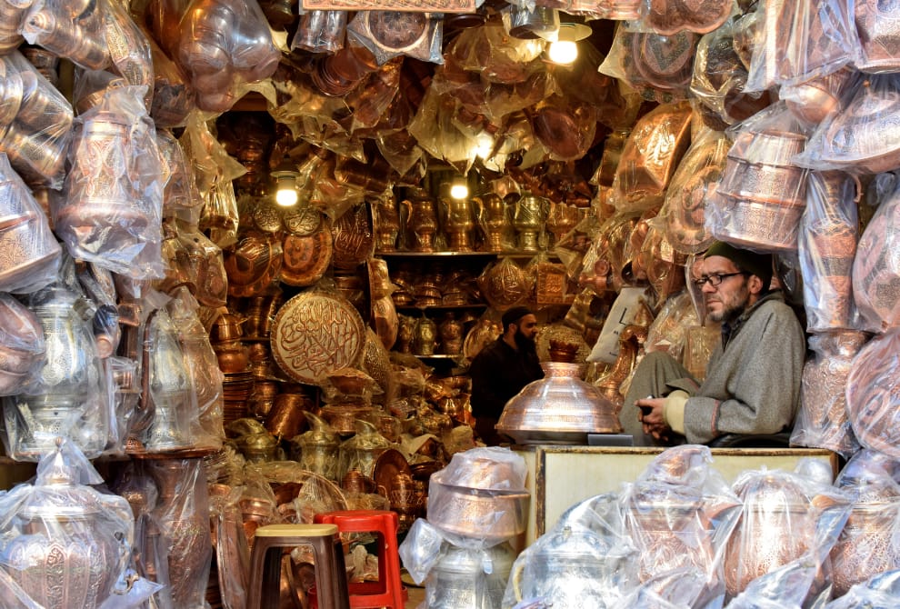 在城鎮斯里納加爾(Srinagar),一名喀什米爾裔(Kashmir)的老闆,正坐在自己的銅器店裡頭,等待著顧客上門。