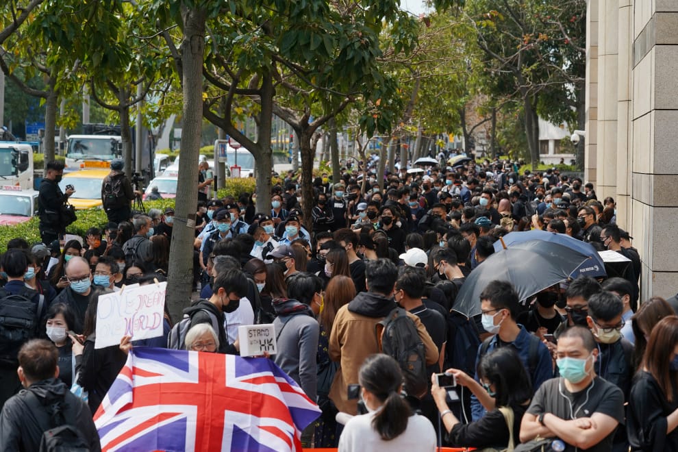在香港,有 47名民主派人士於 2月28日這天遭到檢方以違反《國安法》起訴。法院於是從隔天 3月1日的中午開始,直到 3月2日的凌晨,執行了長達 14小時的馬拉松聆訊。在 1號白天的時候,民主派支持者們帶著英國國旗和標語來到西九龍裁判法院外,聲援被起訴的民主派人士。