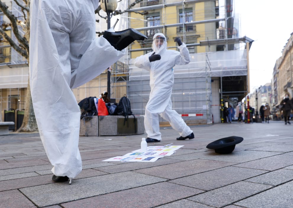 在第二大城市日內瓦(Geneva),日內瓦阿根廷探戈舞蹈學院(Tango Argentin Geneve)的負責人與另一名舞者,一起穿著防護衣,在沒有音樂,且保持 1.5公尺社交距離的情況下,跳著「遠距探戈」。